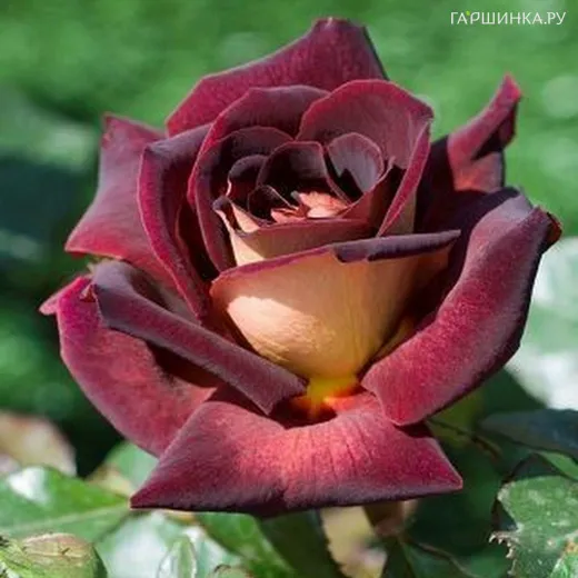 Роза Эдди Митчел чайно-гибридная, Топалович (лиц) - Цветки бархатисто-красные, позднее почти черные, с золотисто-желтой изнанкой. Аромат легкий или отсутствует. Цветки бокаловидные, около 30 лепестков, появляются обычно по одному. Куст ветвистый, средней высоты.