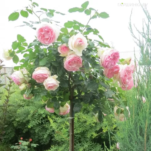 Роза Эден Роуз (Пьер Де Ронсар) на штамбе 90 см - шрабы. Высота штамба 90 см. Окраска цветка светло-розовая, с насыщенным розовым центром. Цветет цветками розеточного типа , диметром 9-11 см. Цветки с легким ароматом. Высокая устойчивость к заболеваниям. Зона зимостойкости 6. Второе цветение слабое.