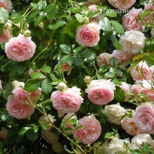 Роза Эден Роуз (Пьер Де Ронсар) плетистая, Топалович (лиц) - высокоустойчивый к болезням сорт с нежно-розовыми крупными цветками. Невысокий, очень ветвистый клаймбер. Листва крупная, ярко-зеленая. Цветки густо-махровые, тяжелые поникают под собственным весом. Лепестки розы кремово-белые с розовым краем, но иногда розовый цвет в бутоне розы преобладает. Сорт был выведен для средиземноморского климата, потому во влажном и прохладном климате бутоны полностью распускаются редко. Цветет повторно летом и осенью. Сорт очень устойчив к заболеваниям. Хорошо зимует под укрытием.