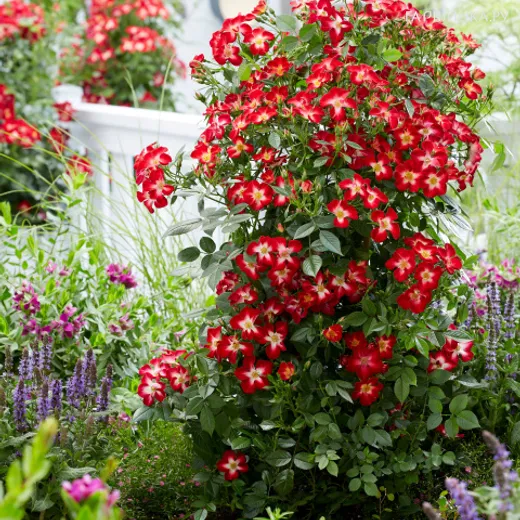 Роза Эверглоу Руби историческая (лиц) - новый сорт с повторным цветением. Цветки имеют привлекательный ярко-красный цвет с красивым желтым центром, который в процессе цветения становится белым. Особенностью этого сорта является то, что после отцветания роза сама сбрасывает цветоножку, поэтому отцветшие цветки не нужно обрезать. Цветет с июля по сентябрь. В возрасте 3-х лет достигает высоты 60-80 см и ширины 40-50 см. Так же подходит для контейнерного выращивания на солнечном месте. Зона зимостойкости 6 (выдерживает до -20С). С укрытием хорошо зимует в средней полосе и Сибири.