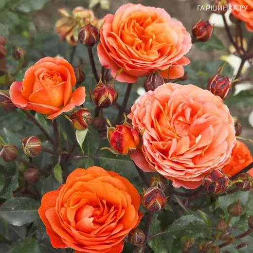 Роза Феникс флорибунда - цветки диаметром 7-8 см, махровые (более 40 лепестков), оранжевые, в соцветиях. Аромат лёгкий. Цветение повторное. Листва глянцевая, устойчивая к заболеваниям. Куст пряморослый, компактный, высотой 70 см и шириной 50 см.