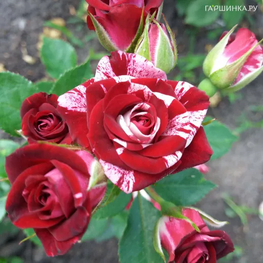 Цветки компактные, диаметром около 4–6 см, махровые, аккуратной формы. Основной цвет лепестков — глубокий тёмно-красный, украшенный белыми полосами и штрихами. Благодаря такой пёстрой окраске каждый цветок выглядит немного по-разному, создавая эффект живописной «игры» оттенков на кусте.