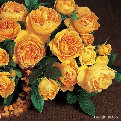 Роза Бернштайн-Роуз флорибунда, Тантау (лиц) «Bernstein» по-немецки означает янтарь, что лучше всего описывает цвет этой великолепной флорибунды. Бутон золотисто-желтый, удлиненный. Цветок янтарно-желтый, чашевидный с черепитчатым расположением лепестков в центре, очень устойчивый к неблагоприятным погодным условиям (солнце, дождь, мороз), густомахровый, 70 - 75 лепестков в одном цветке, обладает терпким ароматом. Цветение раннее, очень обильное, непрерывное, цветки собраны в соцветия. Растение компактное, лист темно-зеленый, матовый, плотный. Используется также как штамбовая форма.