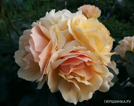 Роза Ханзештадт Росток флорибунда, Тантау (лиц) - Цветок от янтарно-желтого до абрикосового цвета, махровый, диаметр 6-9 см, обладает легким ароматом. Цветение обильное, непрерывное, цветки собраны в соцветия. Растение густое, компактное, высота куста 60-80 см, ширина 50 см. Устойчивость к мучнистой росе и черной пятнистости средняя. Зона зимостойкости 6 (-23).