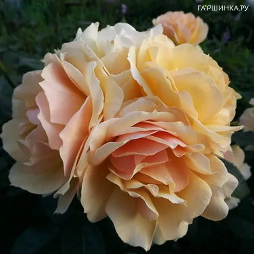 Роза Ханзештадт Росток флорибунда, Тантау (лиц) - Цветок от янтарно-желтого до абрикосового цвета, махровый, диаметр 6-9 см, обладает легким ароматом. Цветение обильное, непрерывное, цветки собраны в соцветия. Растение густое, компактное, высота куста 60-80 см, ширина 50 см. Устойчивость к мучнистой росе и черной пятнистости средняя. Зона зимостойкости 6 (-23).