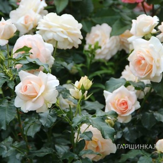Роза Мария Антуанетта флорибунда, Тантау (лиц) Сорт с хорошо выраженными зонтиковидными соцветиями. Цветки кремовые (от абрикосовых до цвета слоновой кости), махровые, восхитительной вазообразной, ностальгической формы, диаметром 8-10 см, очень устойчивые к непогоде. Кусты пышные, побеги быстро нарастают. Очень красиво смотрится в комбинации с многолетниками. Цветение обильное. Сорт устойчив к заболеваниям. В европейских странах завоевал огромную популярность! Аромат: сильный.