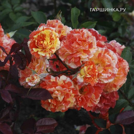 Роза Оранжес энд Лемонс флорибунда, Викс (лиц) Цветки ярко-оранжевые с золотистыми полосами или с желтым «пламенем», махровые, чаще всего в маленьких соцветиях. Аромат легкий фруктовый. Кусты сильные, прямые, густые, высотой 100-150 см. Листья глянцевые темно-зеленые, молодая листва красноватая. Цветки ярче, а цветение обильнее в прохладную погоду.