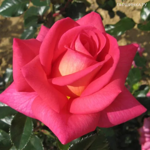 Роза Фрэгрент Ализэ, НИРП (лиц) - Бутоны удлинённые, тёмно-розовые. Цветки диаметром 10-11 см, махровые (28-30 лепестков), с высоким центром, карминно-розовые, обратная сторона лепестков со светло-жёлтыми прожилками, в основном одиночные или в соцветиях по 2-3. В полном роспуске цветок показывает серединку с жёлтыми тычинками. Аромат сильный, с фруктовыми нотками. Цветение повторное. Листва тёмно-зелёная, сильно глянцевая, устойчивая к заболеваниям. Побеги очень крепкие. Куст высотой 60-90 см.