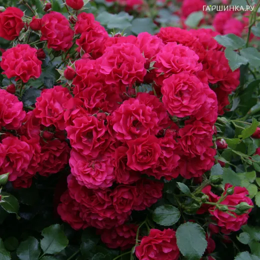 Роза Гартнерфройде/Тоскана, Кордес (лиц) Цветки клубнично-красные, некрупные, густомахровые, в кистях, очень устойчивы к дождю. Размер цветка 4-6 см. Аромата нет. Листва тёмно-зелёная, блестящая, мелкая. Куст широкий, ветвистый, равномерно разрастающийся в ширину и высоту. Высота растения - 30-60 см, ширина - 60 см. Устойчивость к заболеваниям высокая.