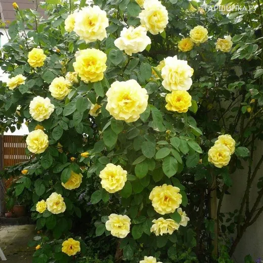 Роза Голден Шауэрс, Викс (лиц) - группа плетистых роз. Плети легко направляются, формируется просто, компактный, длина 2,5-3,0 м. Цветок махровый, ярко-желтый, бокаловидный. Цветки одиночные, и могут быть собраны в соцветия по 4 - 5 шт, лепестки классические, заостренные. Лист зеленый, глянцевый, некрупный. Зона зимостойкости 6 .
