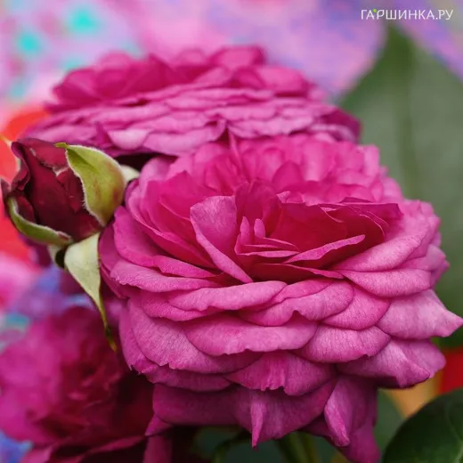 Роза Каффи Фассет Роуз флорибунда, Тантау (лиц) - Сорт был назван в честь мастера лоскутного шитья Каффе Фассетт. Эта роза щедро источает аромат свежего лайма. Куст высотой 50-80 см. Цветки диаметром 8-10 см, махровые, оттенка фиолетовой фуксии. Легко растет как в горшках, так и в открытом грунте.