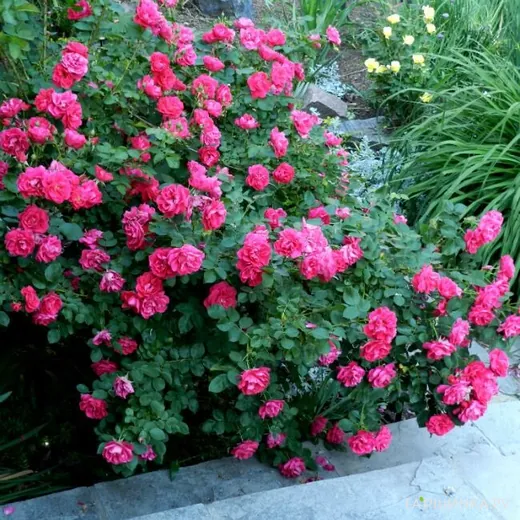 Очень густо цветет. Куст невысокий, но довольно раскидистый. Цвет на фотографиях непередаваем. Он, я бы сказала, кислотно-розовый, и в сумерках кажется, что цветы светятся. Зимы выносит без проблем.