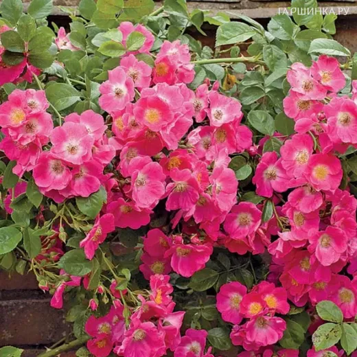 Сила этого сорта просто удивительна. Новые побеги пробиваются из земли, и расцветают кистями слегка чашевидных немахровых цветков вишнево-красного цвета с белым центром. Цветки появляются в большом количестве до первых морозов. Лепестки часто изгибаются внутрь цветка. Листва этой плетистой розы темно-зеленая. Во второй половине лета возможно появление черной пятнистости. Дает большое количество плодов, для увеличения количества цветков необходимо удалять отцветшие цветки. (HR)