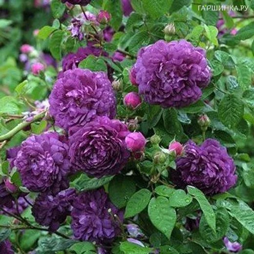 Роза Кардинал де Ришелье, Гийо (лиц) - относится к группе шрабы. Куст формируется легко, высота 1,75 м. Цветки пурпурно-фиолетовые, у основания белые пятна, лепестки волнистые, с обратной стороны розоватые, 6 см, форма соцветия густомахровая, классическая, чашевидная, цветение кистями и одиночное, присутствует легкий приятный аромат. Цветение однократное. Листва зеленая, полуглянцевая, крупная. Зона зимостойкости 6.