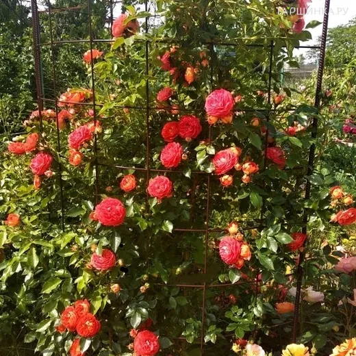 Роза Кармен плетистая, Топалович (лиц) - Компактный клаймбер. Куст быстрорастущий, 150-200 см высотой, с очень прочными побегами. листва зеленая, глянцевая. Цветки густомахровые, 5-6 см диаметром, розетковидные, насыщенного оранжевого цвета с желтым реверсом. Цветение непрерывное в течение всего лета.