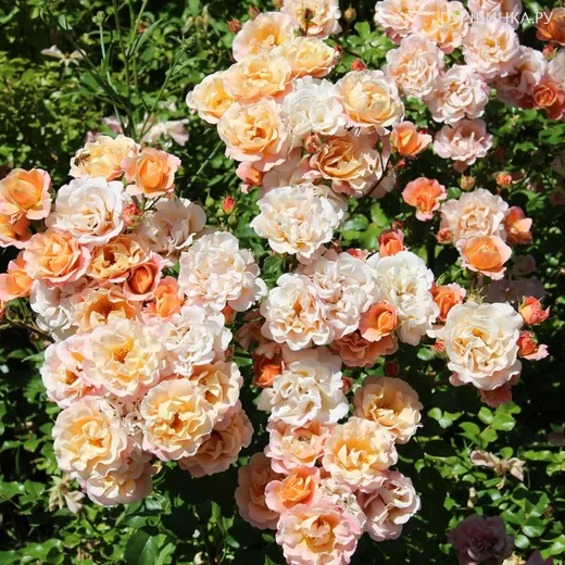 Роза Кубана почвопокровная, Кордес (лиц) цветы вначале роспуска медно-абрикосовые с розоватым оттенком и волнистыми краями лепестков. Со временем розовый цвет становится доминирующим и цветок выглядит розово-абрикосовым, а в конце цветения - розово-кремовым. Махровые цветки распускаются в соцветиях, в каждом из которых до 10 цветков, из красно-розовых, округлых бутонов. Размер цветов 5-6 см. Куст прямостоячий, густой, со временем сильно разрастается в ширину. Высота растения 45 - 50 см, ширина 50 см. Листья темно-зеленые, блестящие. Устойчивость к заболеваниям средняя.