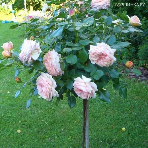Роза Абрахам Дерби на штамбе 110см - Цветки огромные, появляются по одному на концах длинных побегов, или чаще в небольших кистях до 3 шт. Они варьируют по цвету, как и многие розы, в целом выглядят абрикосовыми, или как описывает их сам Остин, нежно-розовые с нежно-желтым в глубине. В холодную погоду двуцветность более заметна, а в жару цветки становятся просто однотонно-абрикосовыми. Аромат очень сильный, фруктовый, с примесью аромата розового масла. Имеет хорошую форму куста. Растение сильнорослое, лист средний, темно-зеленый, глянцевый, кожистый.