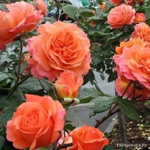 Роза Бельведер кустарниковая, Тантау (лиц) - Цветки оранжево-персиковые, очень крупные, густомахровые, долго не увядают, устойчивы к дождю, образуют поразительный контраст с темно-зелеными сильно глянцевыми листьями. Первое цветение обильное, за ним следуют более слабые волны цветения. Прелестный терпкий аромат. Весьма мощный и сильный куст. Особенно хорош при посадке небольшими группами.