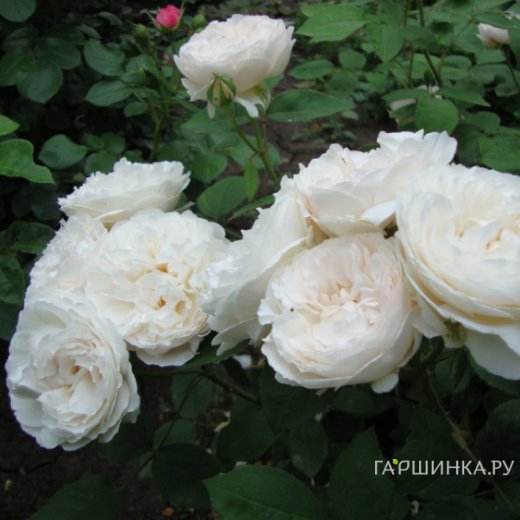Роза Винчестер Кафедрал, Д.Остин кустарниковая (лиц) - Куст хорошо ветвится, одет густой, матовой чисто-зеленой листвой, не подверженной грибковым заболеваниям. Длинные цветочные побеги разветвляются на верхушке и образуют красноваты бутоны, из которых появляются чисто-белые цветки. Они душистые, с чудесным свежим и сладким ароматом старинных роз, меда и цветущего миндаля. Форма цветков рыхлая, несколько неопрятная, однако увядшие цветки легко осыпаются. Роза обильно цветет все лето и осень. Мощные стебли не гнутся под тяжестью соцветий.
