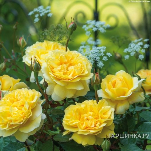 Роза Зе Поэтс Вайф, Д.Остин кустарниковая (лиц) - Это великолепная роза с цветами невыгорающего насыщенно-желтого цвета. Их форма очень красива: кольцо из аккуратно сложенных внешних лепестков обрамляет внутренние лепестки, расположенные менее строго. Куст невысок и от природы округлой формы, поэтому идеально подходит для переднего плана цветников. Роза обладает насыщенным ароматом: сначала в нем сильны лимонные нотки, с возрастом цветка он становится слаще и сильнее.