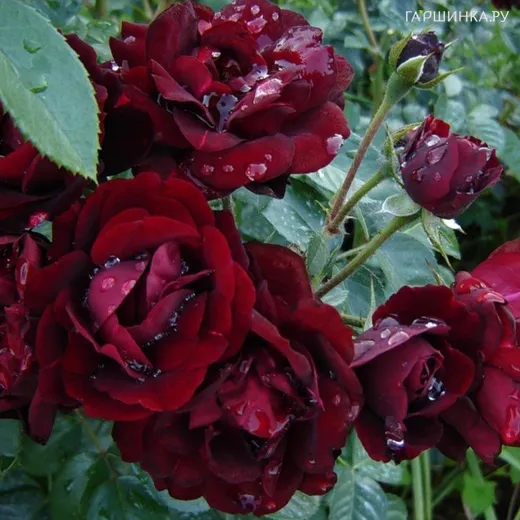 Роза Маликорн, Дельбар (лиц) - группа флорибунда. Высота 1,0 м, куст легко формируется. Цветки кроваво-бордовые, бархатные, 7 см, форма классическая, махровая, чашевидная, лепестки с легкой волной, цветение одиночное и кистями, повторноцветущая, присутствует приятный аромат. Листва крупная, зеленая, полуглянцевая. Обильноцветущий сорт. Зона зимостойкости 6.