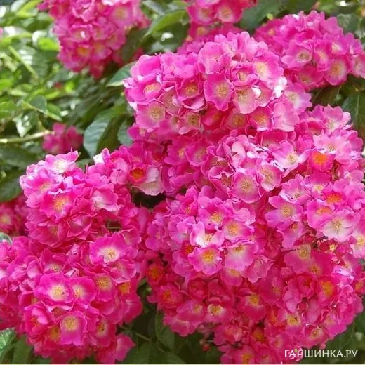 Роза Мария Лиза мускусная, Ленс (лиц) - Цветок малиново-розовый с белым центром и желтыми тычинками, чашевидный, махровый (25 - 35 лепестков), обладает легким ароматом. Прекрасно держит дождь. Растение мощное, сильнорослое с прочными побегами, практически не имеет шипов. Лист темно-зеленый, мелкий, заостренный, глянцевый.