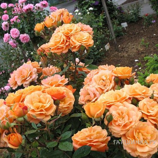 Роза Клементин миниатюрная, Тантау (лиц) Цветки диаметром 5 см, абрикосово-оранжевые, густомахровые, чайно-гибридной формы, появляются в больших зонтиковидных соцветиях, не боятся дождя. Цветение повторное. Кусты прямостоячие, пышные, высотой 40-50 см, побеги быстро отрастают. Отлично подходит для выращивания в контейнерах.
