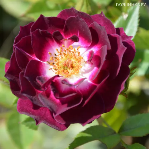 Роза Даймонд Айс, Викс (лиц) Открытые чашевидные темно-фиолетовые с белым пятном и пучком тычинок в центре цветки. Реверс лепестков чуть светлее внутренней окраски. Сильный аромат. Цветение волнами в течение сезона. Куст густой, компактный, с мелкой, темно-зеленой, глянцевой листвой.