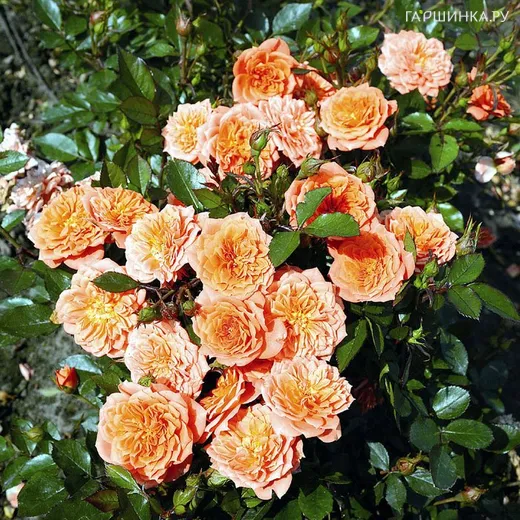 Роза Нинетта миниатюрная, Тантау (лиц) Цветок темно-оранжевый, при распускании становится персиковым, розетковидный, махровый (39 - 55 лепестков), обладает легким ароматом. Диаметр 4-5 см. Цветение обильное, непрерывное, цветки собраны в соцветия, на одном цветоносе в период массового цветения насчитывается 5-10 цветков одновременно. Растение мощное, густое, высота куста 30-40 см, ширина 40 см. Лист оливково-зеленый, мелкий, глянцевый.