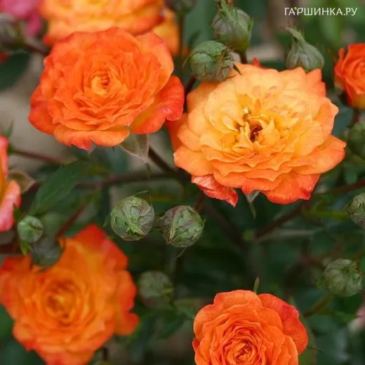 Роза Санмейд миниатюрная, Imperial Rose - Цветки золотисто-желтые с оранжевым оттенком по краям, цвета меняются по мере отцветания. В полном роспуске показывает серединку. Цветет непрерывно в соцветиях. Куст шаровидной формы.