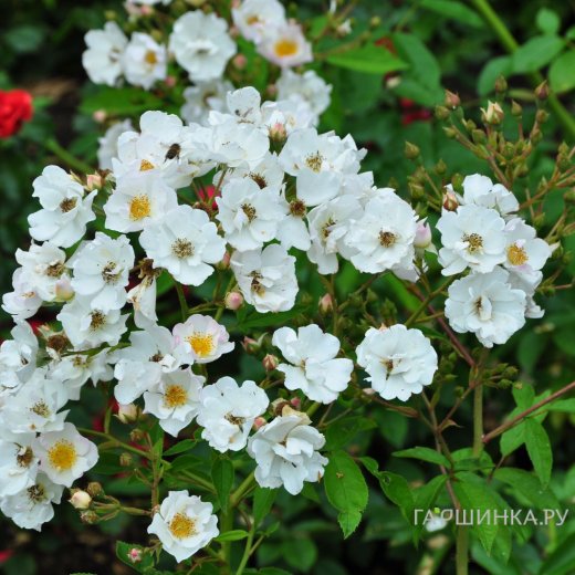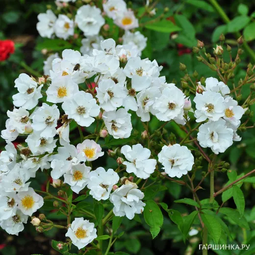 Роза Поэзи мускусная, Ленс (лиц) - Цветки диаметром 4-5 см, полумахровые (9-16 лепестков), белые со светло-розовым центром, в соцветиях. Аромат лёгкий. Цветение почти непрерывное, до заморозков. Листва красивая, большая, тёмно-зелёная, глянцевая, устойчивая к заболеваниям. Куст высотой 60-80 см, хорошо разветвлённый. Побеги свисающие. Устойчивость к заболеваниям высокая. Зона зимостойкости: 6 (-23 °С).