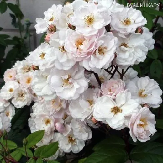 Роза Жан Стефан мускусная, Ленс (лиц) Полумахровые кремово-розовые цветки с мягким ароматом, диаметром 3 см, полумахровые, появляются в больших соцветиях по 15-18 цветков. Иногда соцветия занимают 2/3 длины побега. Аромат слабый. Куст вертикальный, высотой 100-120 см. Листва густая, матовая. Устойчивость к заболеваниям высокая. Зона зимостойкости: 6 (-23 °С).