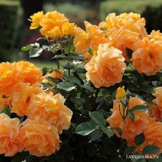Роза Голдэльзе на штамбе 90см - Цветок от медно-желтого до оранжевого, при полном распускании в центре появляется зеленый глазок, плоскочашевидный до чашевидного, махровый, обладает легким фруктовым ароматом. Цветки собраны в соцветия, на одном цветоносе в период массового цветения насчитывается 5 - 7 цветков одновременно Лист темно-зеленый, средний, глянцевый, плотный.