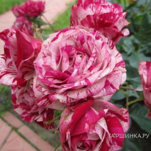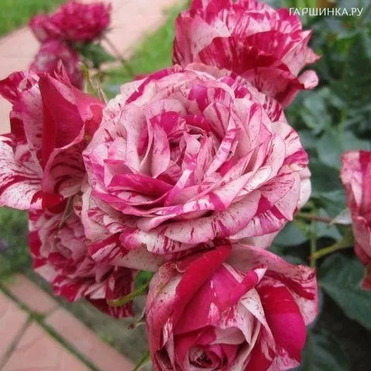Роза Папагено флорибунда, Топалович (лиц) - Бутоны классической формы раскрываются в крупные, малиново-красные цветки с белыми полосками, почти без запаха, очень эффектно выглядящие в саду. Куст сильнорослый, хорошо облиственный. Листва светло-зеленая.