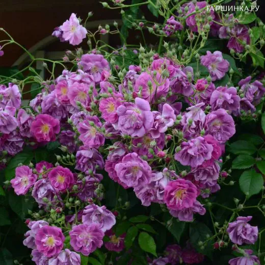 Роза Перпл Скайлайнер. Очень интересная и необычная роза, во время цветения вся усыпана гроздьями ароматных, полумахровых цветов. Цветки некрупные: 3,5 - 4,5 см в диаметре. Цветки вначале сине-фиолетовые, с возрастом выгорают до лавандовых тонов, долго держатся. Цветение в течение всего сезона. Высота взрослого растения 300 см. Сорт выносливый, здоровый, подходит для выращивания в полутени, 6 зона морозостойкий.