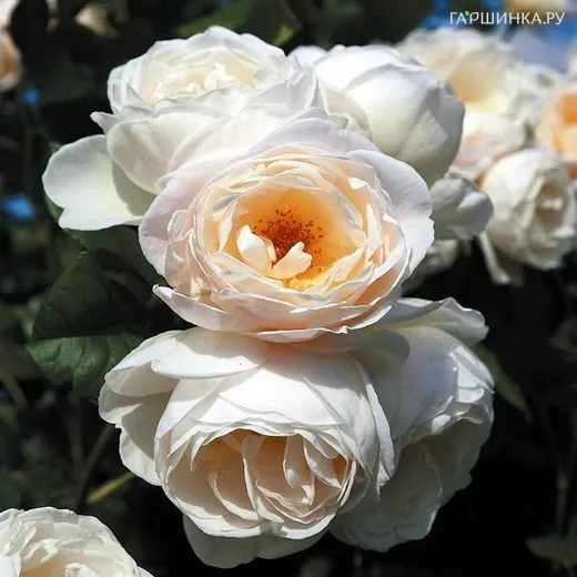 Роза Ютерсен Клостеррозе плетистая, Тантау (лиц) Ветвистая плетистая роза. Цветки кремовые с золотыми тычинками, шаровидные. Повторное цветение очень обильное. Диаметр цветков: 9-11 см. Легкий аромат розового масла. Высота куста: 250-300 см.