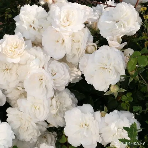Роза Кастельрутер Шпатцен Роуз почвопокровная, Тантау (лиц) Небольшой кустик (40-60 см) полностью покрыт крупными соцветиями белоснежных густомахровых цветков. Диаметр цветка 6-7 см. Часть цветков имеет квартированную ностальгическую форму. В прохладную погоду цветки приобретают розовый оттенок. Аромат легкий фиалковый. Листья глянцевые, темно-зеленого цвета, устойчивые к заболеваниям.
