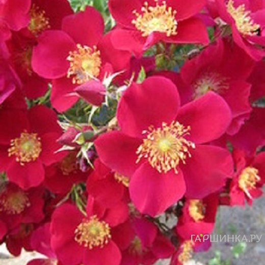 Роза Рубедо почвопокровная Imperial Rose - Цветки алые с пучком ярко-желтых тычинок и легким ароматом. Цветки очень мелкие, простые (5 лепестков), собраны в кисти по 5-10 штук, появляются в течение всего лета и осенью.