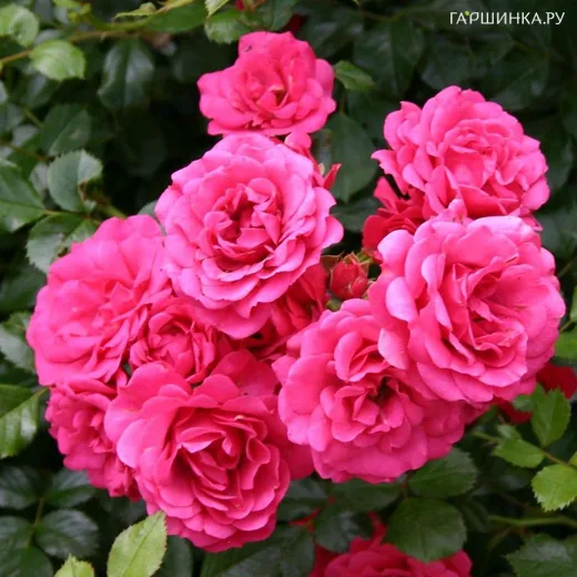 Роза Роди почвопокровная, Тантау (лиц) Махровые некрупные цветки имеют стойкую малиново-розовую окраску и собраны в огромные соцветия. Цветение обильное. Кол-во цветков на стебле: 5-10. Размер цветка: 4-5 см. Куст выглядит плотным за счет многочисленных побегов и обильной листвы.