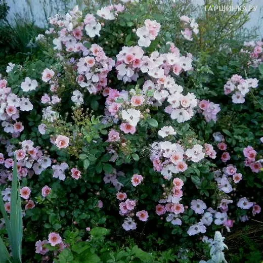 Роза Сатин Хейз почвопокровная, Тантау (лиц) Цветки розовые, равномерно окрашенные, диаметром 5-6 см, очень крупные для этой группы. Среднее кол-во лепестков: 8. Цветение обильное, повторное. Листва тёмная, глянцевая, высокоустойчивая к заболеваниям.