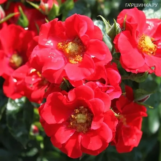 Роза Альпенглюхен почвопокровная, Тантау (лиц) Ярчайшая красная почвопокровная роза. Цветки в диаметре 3-5 см, средне махровые (15-20 лепестков). Сорт не из высоких, всего 60 см в высоту, побеги дугообразные. Куст усыпан свежими, глянцевыми, зелеными листьями, которые иногда прорываются многочисленных цветков и возвышаются над ними. Одна из самых устойчивых к заболеваниям.
