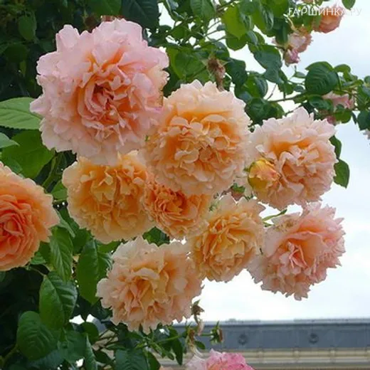 Роза Полька плетистая, Топалович (лиц) - Цветки махровые, средние или крупные, появляются по одному или в небольших кистях на концах жестких побегов. Они медно-лососевые, выгорают до лососево-розовых, но в глубине цветка сохраняют медные тона. Аромат очень слабый. Идеальна для столбов, стен и изгородей, где нужна невысокая плетистая роза. Куст сильнорослый, довольно ветвистый, листва обильная, блестящая.