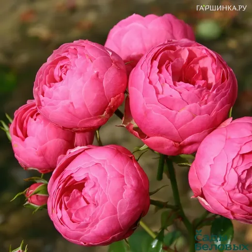 Бутоны темно-розово-лососевые. Цветки густомахровые, темно-розовые. Диаметр 5 см. Листья темно-зеленые, полуглянцевые.