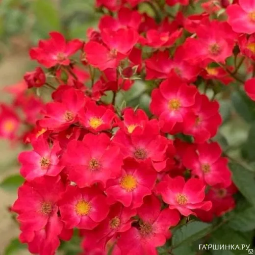Роза Поппи Роуз мускусная, Ленс (лиц) - группа мускусных гибридов. Растение высотой 1,0 м. Цветки темно-красные, яркие, 4 см, форма похожа на соцветия мака, цветение одиночное и кистями, аромат легкий. Листва крупная, зеленая, полуглянцевая. Зона зимостойкости 6.