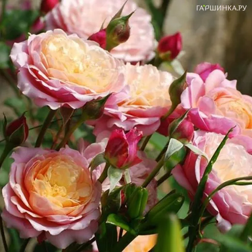 Роза Прикс ПЖ Редут шраб, Гийо (лиц) Цветки густомахровые, округлые, переливающиеся, розово-малиновые с медным центром, в соцветиях по 5-6 цветков. Диаметр 6-8 см. Аромат сильный жасмина, ванили и розы. Листва тёмно-зелёная, блестящая. Кусты высотой 80 см, шириной 70 см. Устойчивость к заболеваниям высокая.