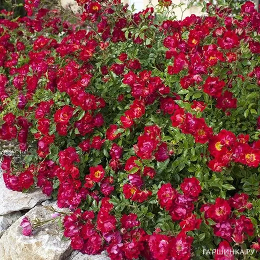 Роза Ред Дрифт, Мейян (лиц) - группа почвопокровная. Растение высотой 0,5 м. Цветки красные, 9 см, закручены по спирали, форма классическая, цветение кистями. Листва крупная, зеленая, полуглянцевая. Зона зимостойкости 6.