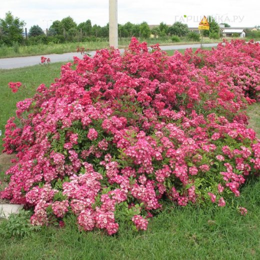 Роза Ред Естудей почвопокровная, Топалович (лиц) - цветки немахровые, малиновые с белым центром, оттеняются ярко-желтыми тычинками. Они мелкие, но появляются в крупных кистях, обычно по 20-60 шт., так что привлекают к себе внимание в саду – это более яркий и вызывающий сорт. Цветки сохраняют окраску и долго держатся, после них обычно созревают мелкие красные плоды. Листва ярко-зеленая, тонкая, блестящая. Куст ветвистый, все время выпускает новые цветоносные побеги, его можно пустить виться по стене, как плетистую розу. Цветет без устали.