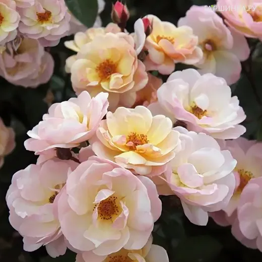 Роза Рокн Роуз, НИРП (лиц) - Цветки плоские, диаметром 6 см, полумахровые (до 15 лепестков), нежно-розовые с желтовато-кремовым центром, в маленьких соцветиях. Аромат лёгкий. Цветение очень обильное, непрерывное, в течение сезона. Кусты густые, очень сильные, высотой 100-110 см, шириной 70-80 см. Листва тёмно-зелёная, полуглянцевая, высокоустойчивая к заболеваниям. Рекомендуется для живых цветущих изгородей и групповой посадки.