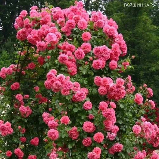 Роза Розариум Ютерсен плетистая, Топалович (лиц) - Цветы от темно-розовых до серебристо-розовых, плоские, густомахровые (80 лепестков), душистые. Располагаются в небольших соцветиях (по 3-5 штук). Цветки немного выгорают с возрастом, что подчеркивает красоту новых и кистей в целом. Листва крупная, блестящая и здоровая. Сорт зимостоек и прекрасно выдерживает плохую погоду. Кусты раскидистые с толстыми прочными плетевидными побегами и тонкими шипами. Аромат: легкий.