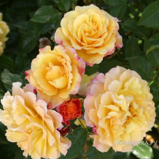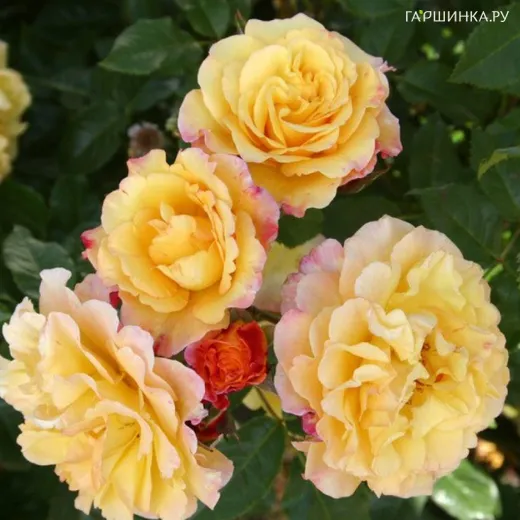 Роза Ругельда парковая, Кордес (лиц) - относится к группе флорибунда. Куст прямостоячий, формируется легко, высота 1,7 м., компактный. Цветение одиночное, и в кистях, обильное и продолжительное, повторное. Цветок 8 см, махровый, форма чашевидная, окраска лимонно-желтая, край красный, присутствует аромат. Лист матовый, темно-зеленый. Устойчив к дождю и заболеваниям. Зона зимостойкости 5.